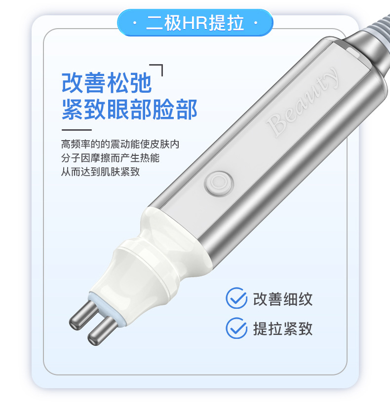 通过探头可发出每秒震动高达六百万次的无线电波,高频率的的震动能使皮肤内的分子因摩擦而产生热能,从而达到肌肤紧致