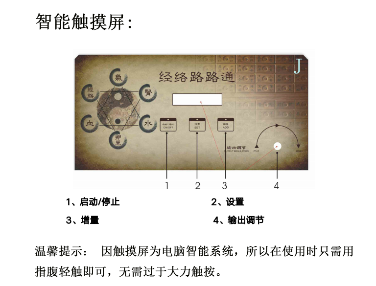 3.每次开机之前将能量旋钮扭到最小再开机,根据顾客身体承受能力调整能量大小,从小往大调整。直到客户有微微麻麻的感觉,再根据顾客的承受能力增加或者减小能量。经