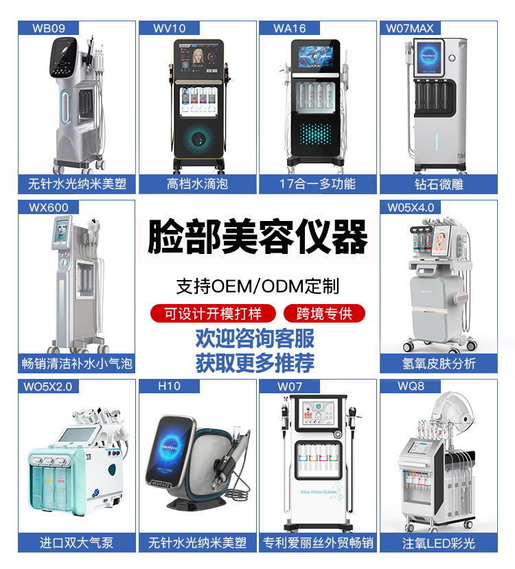 型号:NV-WB09仪器规格:111.5*54.5*37CM仪器重量:20KG功率:200W保修期:1年仪器功能:产品导入,水光,面部清洁收缩毛孔,改善面部轮廓等
